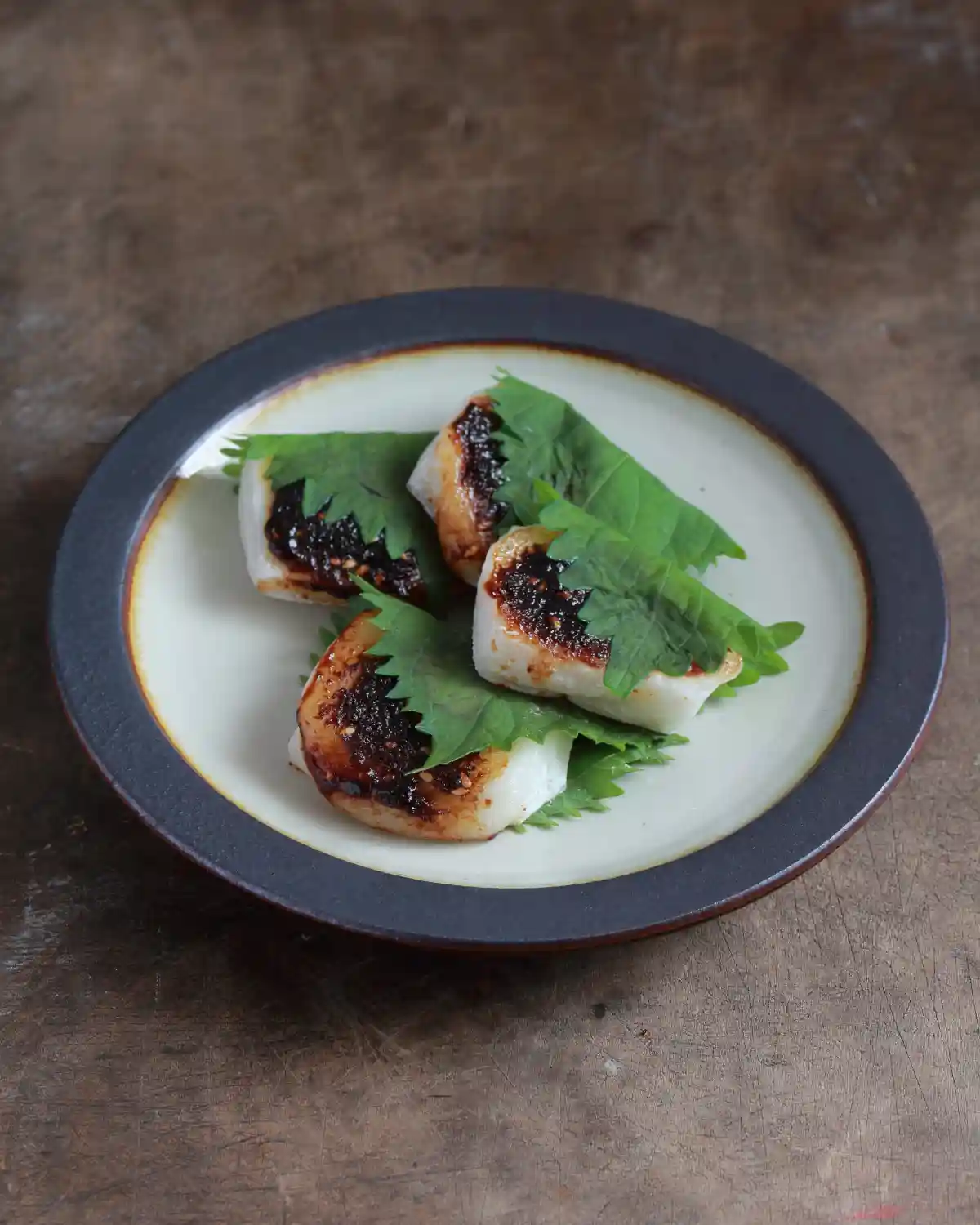 味噌だれを塗って焼いた餅を、大葉で巻いていただきます。香ばしく焼けた甘辛い味噌と餅の相性のよさはもちろんのこと、大葉の爽やかさがいっそう美味しさを引き立てます。