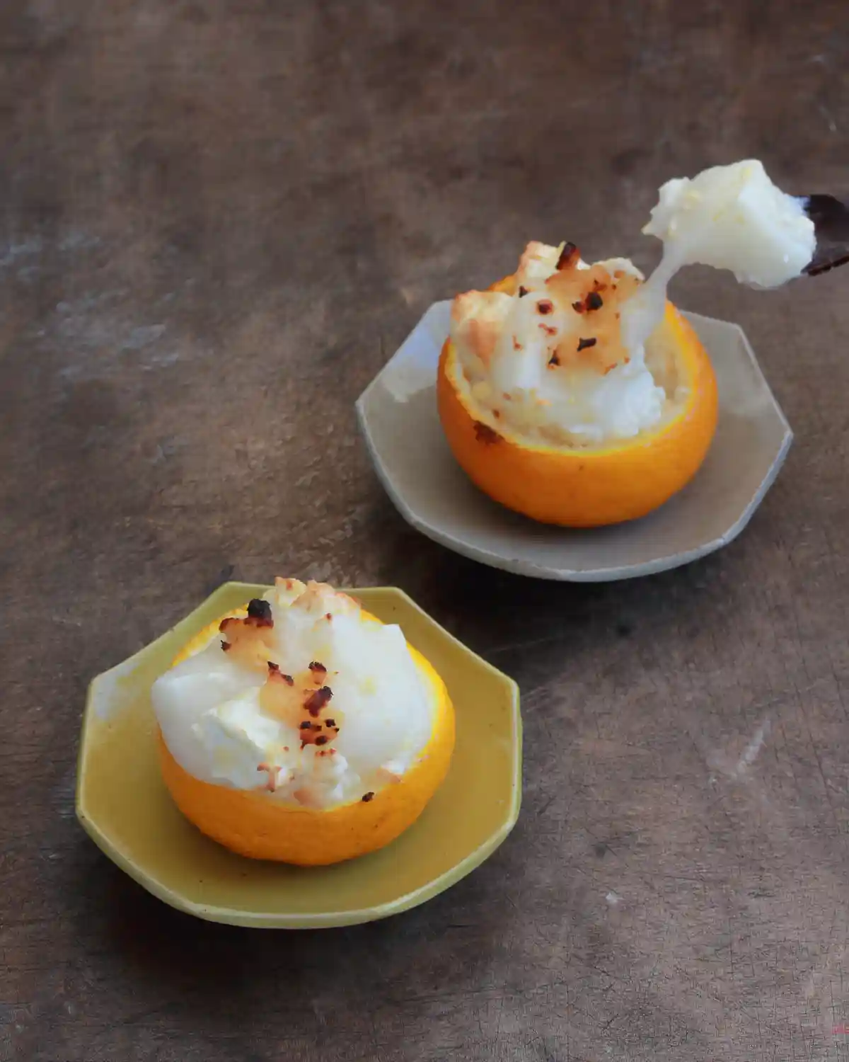 - 2. 1を柚子に詰め、上に白味噌をのせ、200℃のオーブンまたはグリルで焼き色がつくまで10分ほど焼く。